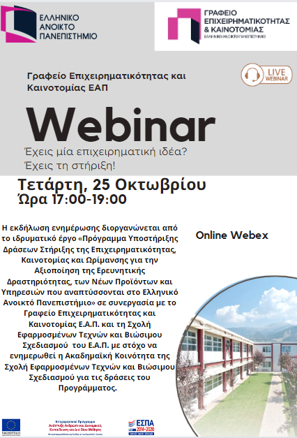 Την Τετάρτη 25 Οκτωβρίου 2023 (ώρα 17:00 – 19:00) θα πραγματοποιηθεί διαδικτυακό σεμινάριο (webinar).
