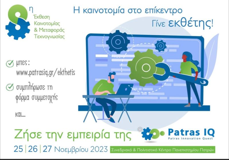 3 Νοεμβρίου 2023Η Έκθεση Καινοτομίας & Μεταφοράς Τεχνογνωσίας – Patras lnnovation Quest (PATRAS IQ), αποτελεί συνδιοργάνωση του Υπουργείου Ανάπτυξης & Επενδύσεων και Υπουργείου Παιδείας & Θρησκευμάτων, της Περιφέρειας Δυτικής Ελλάδας, του Πανεπιστημίου Πατρών, του Ελληνικού Ανοιχτού Πανεπιστημίου και του Επιμελητηρίου Αχαΐας. Κύριος στόχος είναι η δημιουργία κρίσιμου ανταγωνιστικού πλεονεκτήματος, τόσο στην ερευνητική κοινότητα όσο και στον παραγωγικό τομέα, μέσω της εφαρμογής καινοτόμων ιδεών για την ανάπτυξη νέων και την βελτιστοποίηση υπαρχόντων προϊόντων και υπηρεσιών που φιλοδοξούν να καταλάβουν μερίδιο στην εθνική και παγκόσμια αγορά.